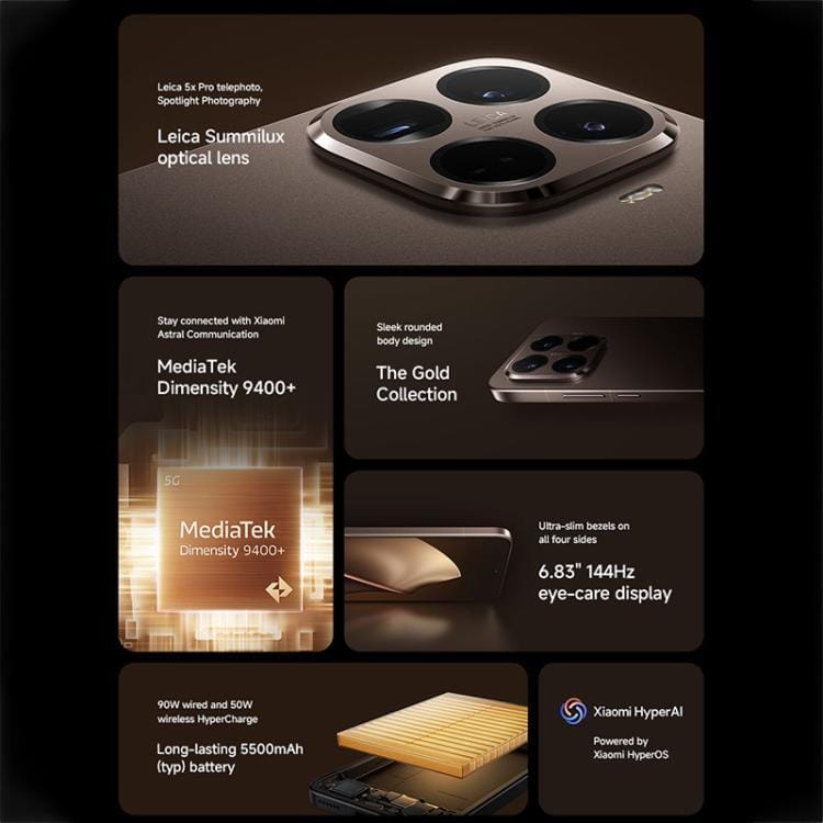 1. Processor: MediaTek Dimensity 9400+ octa-core, 3nm, 1 x Cortex-X925 up to 3.73GHz + 3 x Cortex-X4 up to 3.3GHz + 4 x Cortex-A720 up to 2.4GHz 2. GPU: Immortalis-G925 MC12 3. Memory Capacity: 12GB+512GB / LPDDR5X + UFS 4.1 4. Operating System: Xiaomi HyperOS 2 5. Unlocking: Screen fingerprint, AI face unlock 6. Sensors: Proximity sensor, ambient light sensor, accelerometer, gyroscope, electronic compass, IR blaster, flicker sensor, X-axis linear vibration motor, color temperature sensor 7. Charging port: Type-C 8. SIM card slot: Dual SIM card slot(nano SIM + nano SIM or nano SIM + eSIM, eSIM + eSIM), Use of eSIM requires a wireless service plan. 9. Languages: Arabic, Afrikaans, Amharic, Bengali, Bulgarian, Burmese, Catalan, Dutch, Croatian, Czech, Danish, English, French, Finnish, Filipino, Greek, German, Hungarian, Hindi, Hebrew, Indonesian, Italian, Japanese, Khmer, Latvian, Malay, Norwegian, Persian, Portuguese, Polish, Russian, Romanian, Serbian, Swedish, Spanish, Turkish, Thai, UKrainian, Vietnamese, Simple Chinese, Traditional Chinese, Urdu, Estonian, Lithuanian, Slovak, Slovenian, Bosnian 10. Dimensions: 162.7 x 77.9 x 7.96mm 11. Weight: 210g Screen Display: 1. Screen: 6.83 inch AMOLED, Corning Gorilla Glass 7i 2. Pixels: 2772 x 1280, 447ppi 3. Refresh Rate: 144Hz Battery: 1. Battery capacity: 5500mAh 2. Charging power: 90W HyperCharge, 50W wireless HyperCharge 3. Fast charging: Support PD3.0 / PD2.0 Cameras: 1. Rear Camera: 50MP + 50MP + 12MP 2. Front camera: 32MP Network Band: 1. 5G: SA N1/2/3/5/7/8/12/20/25/26/28/38/40/41/48/66/71/75/77/78; NSA N1/3/5/7/8/20/28/38/40/41/66/71/75/77/78 2. 4G: FDD-LTE B1/2/3/4/5/7/8/12/13/17/18/19/20/25/26/28/32/66/71; TDD-LTE: B38/39/40/41/42/48 3. 3G: WCDMA B1/2/4/5/6/8/19 4. 2G: GSM B2/3/5/8 Wireless Network: 1. WiFi: Wi-Fi 7/Wi-Fi 6E/Wi-Fi 6, 2×2 MIMO, WiFi Direct 2. BT: V6.0 3. Navigation: GPS, Galileo, GLONASS, Beidou, QZSS, NavIC 4. Support NFC 1. Phone x 1 2. USB Type-C Cable x 1 3. SIM Eject Tool x 1 4. Protective Case x 1 5. Power Adapter x 1 6. Quick Start Guide and Warranty Card x 1 (The actual product shall prevail)