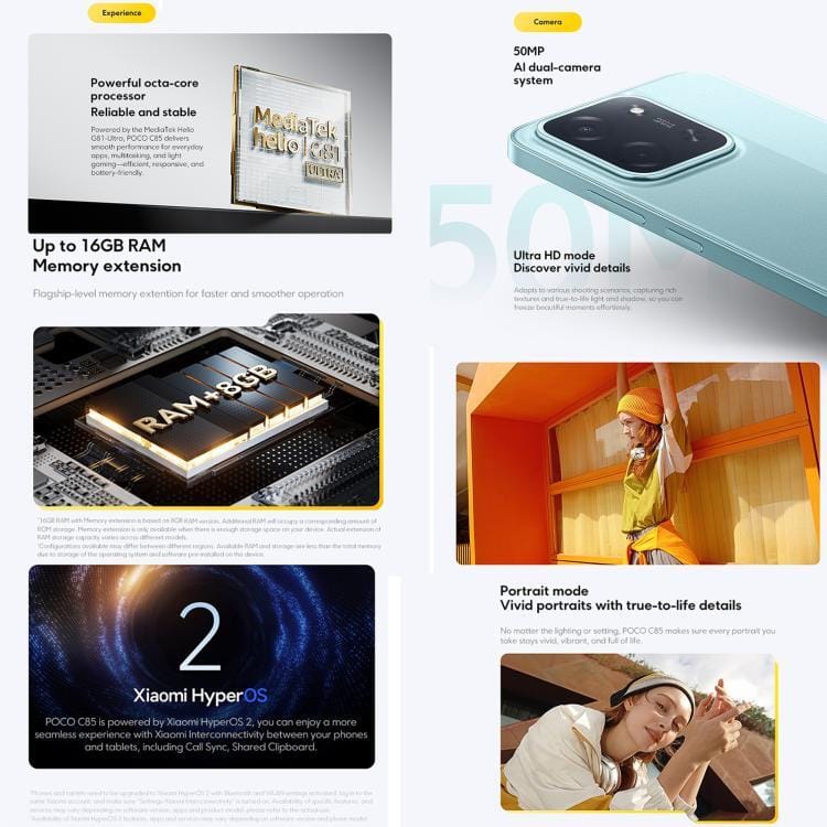Specifications: 1. CPU: MediaTek Helio G81-Ultra, Cortex-A75 + Cortex-A55 2.0GHz; GPU: Mali-G52 MC2 2. Memory: 8GB RAM + 256GB ROM / LPDDR4X + eMMC 5.1; Support 1TB microSD card (not included) 3. Operating System: Xiaomi HyperOS 2 4. Battery capacity: 6000mAh 5. Charging: Type-C, 33W 6. Headphone Port: Type-C 7. SIM Card: Dual SIM 8. Sensor: Virtual proximity sensor, Ambient light sensor, Accelerometer, Electronic compass 9. NFC: Support 10. Security: Side fingerprint sensor, AI face unlock 11. Size: 171.56 x 79.47 x 7.99mm 12. Weight: 205g 13. Languages: Arabic, Afrikaans, Amharic, Bengali, Bulgarian, Burmese, Catalan, Dutch, Croatian, Czech, Danish, English, French, Finnish, Filipino, Greek, German, Hungarian, Hindi, Hebrew, Indonesian, Italian, Japanese, Khmer, Latvian, Malay, Norwegian, Persian, Portuguese, Polish, Russian, Romanian, Serbian, Swedish, Spanish, Turkish, Thai, UKrainian, Vietnamese, Simple Chinese, Traditional Chinese, Urdu, Estonian, Lithuanian, Slovak, Slovenian, Bosnian Screen: 1. Size: 6.9 inch 2. Refresh Rate: 120Hz 3. Resolution: 1600 x 720 Camera: 1. Rear Camera: 50MP F1.8 2. Front Camera: 8MP F2.0 Network and Connections: 1. WiFi: 2.4GHz, 5GHz 2. Network Bands: A. 2G GSM: B2/3/5/8 B. 3G WCDMA: B1/2/4/5/8/6/19 C. 4G TDD: B38/40/41; FDD: B1/2/3/4/5/7/8/18/19/20/26/28/66 3. Navigation: GPS, Glonass, Galileo, Beidou 4. BT: V5.4 Package List 1. Phone x 1 2. Power Adapter x 1 3. USB Type-C Cable x 1 4. SIM Ejector Tool x 1 5. Protective Case x 1 6. User Manual x 1 7. Warranty Card x 1 (Contents in the package may differ across different regions.)