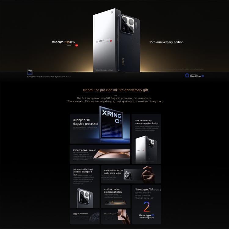 Specification: 1. Processor: Xring O1 3nm deca-core, up to 3.9GHz 2. GPU: Immortalis-G925 16 core 3. Memory Capacity: 16GB LPDDR5T+ 1TB UFS 4.1 4. Operating System: Xiaomi HyperOS 2 5. Fingerprint unlocking: 3D ultrasonic fingerprint 6. Sensors: Distance sensor, Under-screen ambient light (color temperature) sensor, Rear ambient light (color temperature) sensor, Accelerometer, Gyroscope, Electronic compass, X-axis linear motor, Infrared remote control, Flicker sensor, Laser focus sensor, Barometer 7. Charging port: Type-C 8. SIM card slot: Dual Nano-SIM card slot 9. Languages: English, Simple Chinese, Traditional Chinese (more languages can be refreshed and updated) 10. Dimensions: 161.3 x 75.3 x 8.33mm 11. Weight: 216g Screen Display: 1. Screen: 6.73 AMOLED 2. Pixels: 3200 x 1440 3. Refresh Rate: 120Hz 4. Sampling Rate: 300Hz Battery: 1. Battery capacity: 6100mAh 2. Charging power: 90W wired / 50W wireless charging Cameras: 1. Rear Camera: 50MP Hunter 900 High Dynamic Range Main + 50MP 120mm Leica periscope telephoto + 50MP 115 degree Leica ultra-wide angle 2. Front camera: 32MP Network Band: 1. 5G: N1/2/3/5/7/8/12/20/26/28/38/40/41/48/66/77/78/79 2. 4G: FDD-LTE: B1/2/3/4/5/7/8/12/17/18/19/20/26/28/66; TDD-LTE: B34/38/39/40/41/42/48 3. 3G: WCDMA: B1/2/4/5/6/8/19 4. 2G: GSM: B2/B3/B5/B8 (Note: The actual network and frequency band usage depends on the deployment of local operators) Wireless Network: 1. WiFi: Supports Wi-Fi 7, Wi-Fi 6, W-iFi 5, Wi-Fi 4 and 802.11a/b/g; 2.4GHz /5GHz 2. BT: V5.4 3. Navigation: BeiDou, GPS, Galileo, GLONASS, QZSS, AGNSS 4. Support multi-function NFC Package List: 1. Mobile Phone x 1 2. Eject Pin x 1 3. Protective Case x 1 4. USB Cable x 1 5. US Plug Power Adapter x 1 6. Pre-attached Protective Film x 1 (The actual product shall prevail)