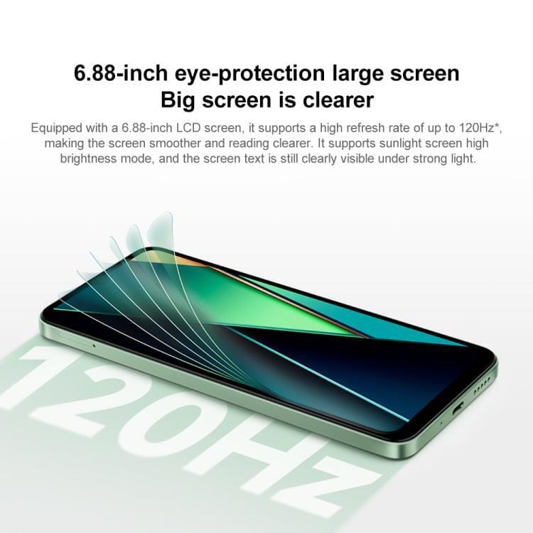 Specifications: 1. CPU: MediaTek Helio G81-Ultra octa core, 2.0GHz 2. GPU: ARM Mali-G52 MC2 3. Memory Capacity: 4GB+128GB 5. Operating System: Xiaomi HyperOS 6. Sensors: Vibration motor, acceleration sensor, ambient light sensor, virtual distance sensor, electronic compass 7. Languages: English, Simple Chinese, Traditional Chinese (more languages can be refreshed and updated) 8. SIM card slot: Dual Nano-SIM card slot 9. Charging Interface: Type-C 10. Battery: 5160mAh non-removable battery 11. Charging Power: 18W 12. Size: 171.88 x 77.8 x 8.22mm 10. Weight: 204g Screen Display: 1. Screen: 6.88 inch screen, 1640 x 720 2. Refresh frame rate: 120Hz 3. Touch sampling rate: 240Hz Cameras: 1. Rear Camera: 13MP 2. Front Camera: 5MP Network Band: 1. 4G: FDD-LTE: B1/B3/B5/B8; TDD-LTE: B34/B38/B39/B40/B41 2. 3G WCDMA: B1/B5/B8 3. 2G GSM: B3/B5/B8 Wireless Network: 1. WiFi: Wi-Fi 5 802.11a/n/ac and Wi-Fi 4 802.11b/g/n; WLAN frequency: 2.4G Wi-Fi, 5G Wi-Fi 2. Bluetooth: Bluetooth 5.4 3. Positioning: Beidou, GPS, Galileo, GLONASS, AGNSS, Data network positioning, Wi-Fi network positioning Package List 1. Phone x 1 2. Eject Pin x 1 3. Protective Case x 1 4. USB Cable x 1 5. US Plug Charger x 1 6. Protective Film (Pre-attached) x 1 (The actual product shall prevail)